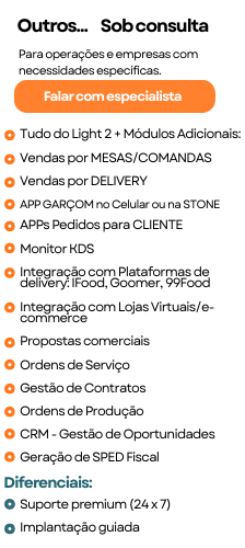 - Demais módulos e APPs como Cardápio digital, Monitor KDS, TEF, ERP para mais usuários, ERP WEB e Dados na Nuvem: Consulte-nos no Whatsapp (19) 99588-4855.